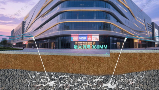 方案采用微孔注入工艺,通过小型化设备向筏板下回填土层地基注入新型特种复合材料,材料在渗透、填充并挤密地基后快速固结土体,形成强度高、防渗性能好的结构体,并在建筑基础下增设近似圆柱体的复合桩基,过程中产生向上的顶升力,结合可视化智能实时监测系统,抬升过程精准可控,抬升精度可达毫米级,实现地基稳固与基础柔性抬升,倾斜建筑高效抬升纠偏。方案实施全程不影响商贸城正常运营,不破坏原建筑结构;方案采用新型抗酸抗碱材料,无毒无污染,节能低碳,且从根源上提高地基承载力,增强整体稳定性和耐久性。